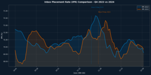 | Inbox Placement Rate (IPR) | ~70 – 71 % | 74 – 75 % | ~68 – 70 % | –4 to –6 pp |